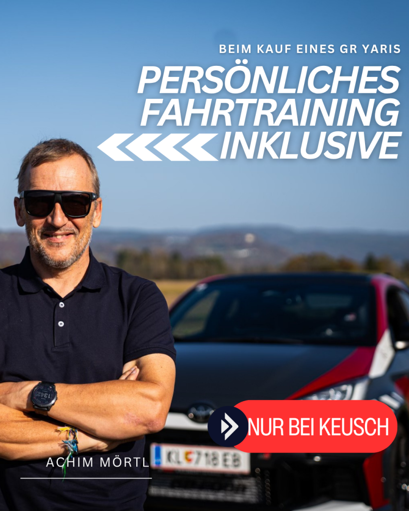 Eine besondere Ergänzung ergibt sich in Österreich durch die Zusammenarbeit mit Keusch – Das Autohaus mit Achim Mörtl. Käufer eines neuen GR Yaris erhalten ein eintägiges Fahrtraining in der Alpe-Adria-Region unter Anleitung von Achim Mörtl. Dieses Konzept ist aus technischer Sicht konsequent, da der GR Yaris seine fahrdynamischen Qualitäten erst dann vollständig entfaltet, wenn das Zusammenspiel aus Allradsystem, Reifen und Fahrwerk verstanden und entsprechend genutzt wird.