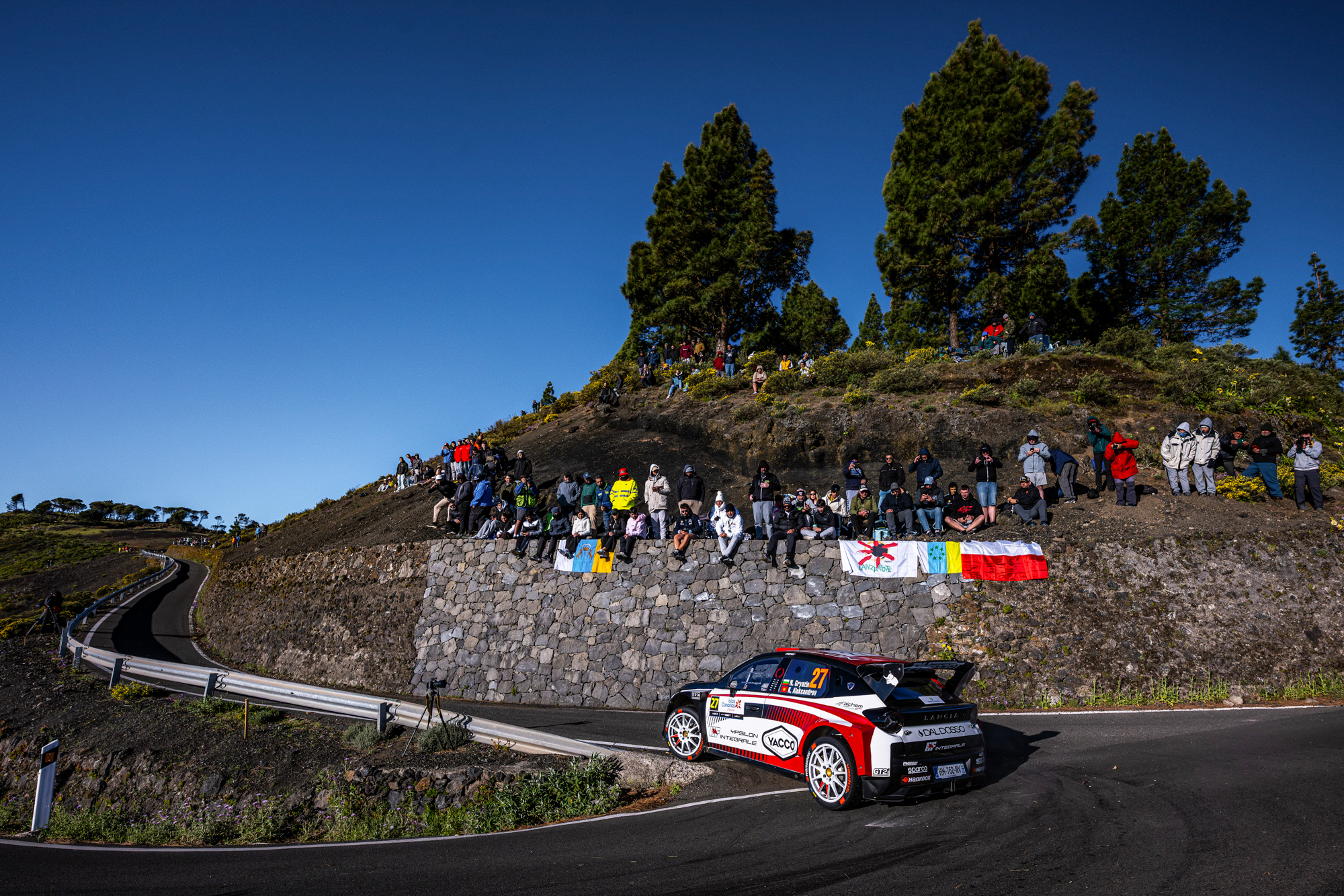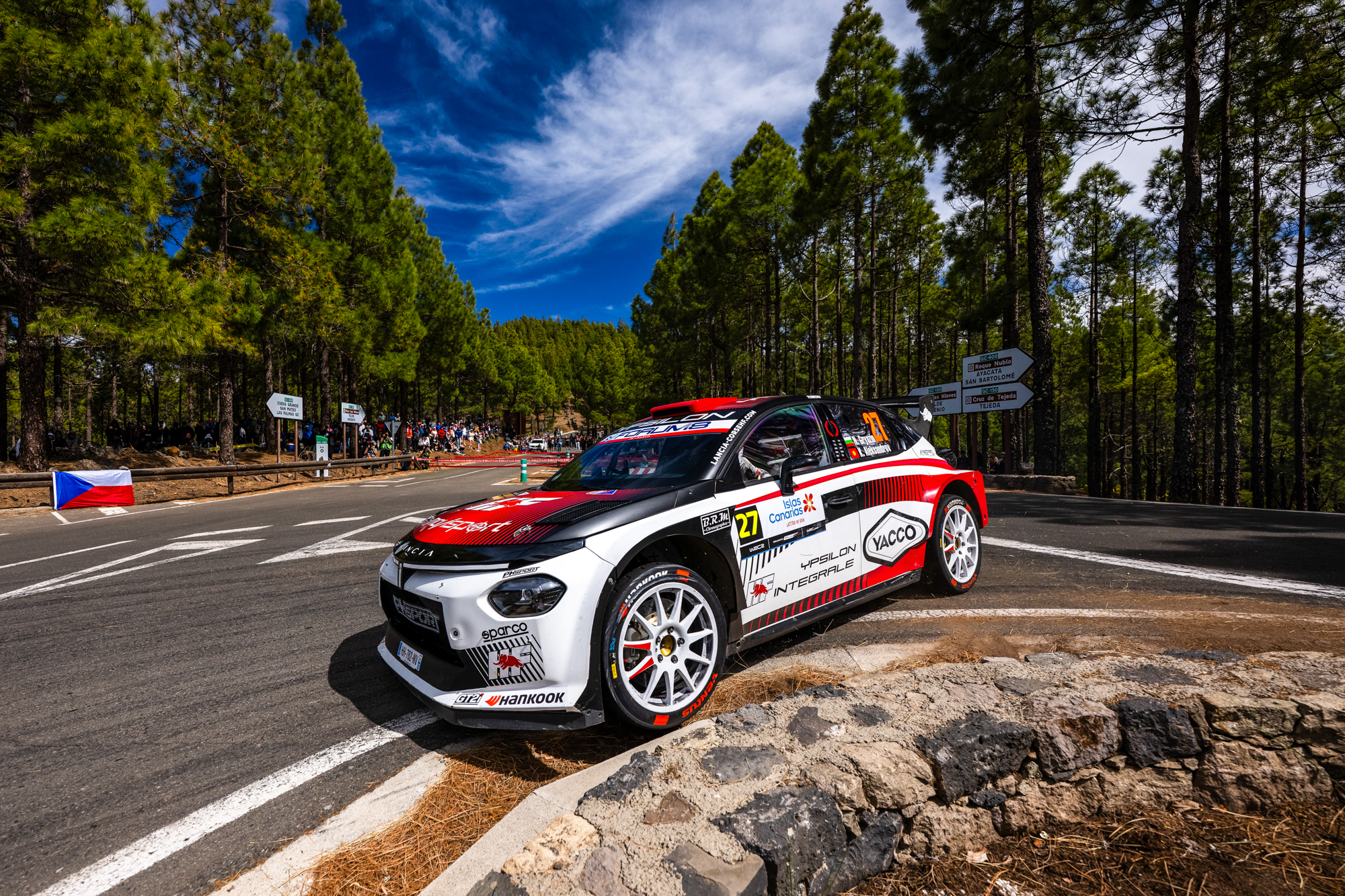 Der Samstag brachte die für diese spanische Rallye typischen Mischbedingungen, mit Regen und rutschigen Passagen im Wechsel mit Sonne, Hitze und dem für die Vulkaninsel charakteristischen abrasiven Asphalt. Rossel und Dunand bewältigten diese Herausforderungen nahezu perfekt: Ein präzise abgestimmtes Setup und punktgenaue Reifenwahl ermöglichten es Lancia Corse HF, den Ypsilon Rally2 HF Integrale zurück auf die oberste Stufe des Podiums zu bringen.